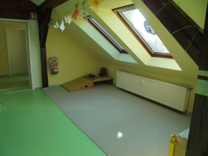 Obergeschoß wird eine altersgemischte Gruppe, die sich in zwei Untergruppen